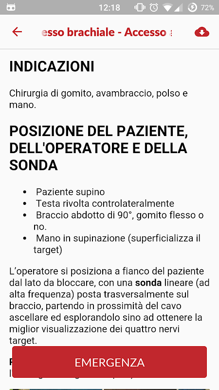 L’app contiene una descrizione pratica e breve per i maggiori blocchi per l’arto superiore, inferiore e per l’addome, immagini per identificare rapidamente posizioni e reperi anatomici e infine un video con l’esecuzione completa del blocco. Ogni blocco è consultabile on-line oppure scaricabile sul proprio dispositivo mobile tramite l’apposito bottone (nuvola in basso a desta dello schermo) per permetterne una fruizione anche in ambienti senza segnale.