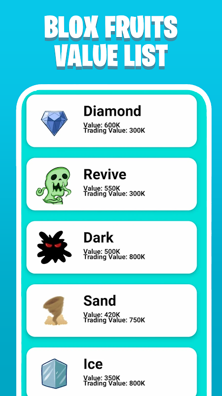 แอปพลิเคชั่นนี้ประกอบด้วยรายการค่าที่คุณจะสามารถดูราคาผลไม้ได้ นอกจากนี้ยังมีส่วนที่คุณจะสามารถเข้าร่วมเซิร์ฟเวอร์ส่วนตัวและสุดท้ายคือรายการรหัส bloxfruits ที่ใช้งานอยู่และทั้งหมดนี้จากโทรศัพท์มือถือของคุณ!