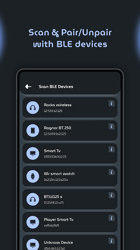 ด้วยฟีเจอร์ BLE Scanner คุณสามารถค้นหาและเชื่อมต่อกับอุปกรณ์ Bluetooth ที่จับคู่อยู่ได้อย่างง่ายดาย ไม่ว่าจะเป็นหูฟัง อุปกรณ์ติดตามการออกกำลังกาย หรือลำโพงอัจฉริยะ