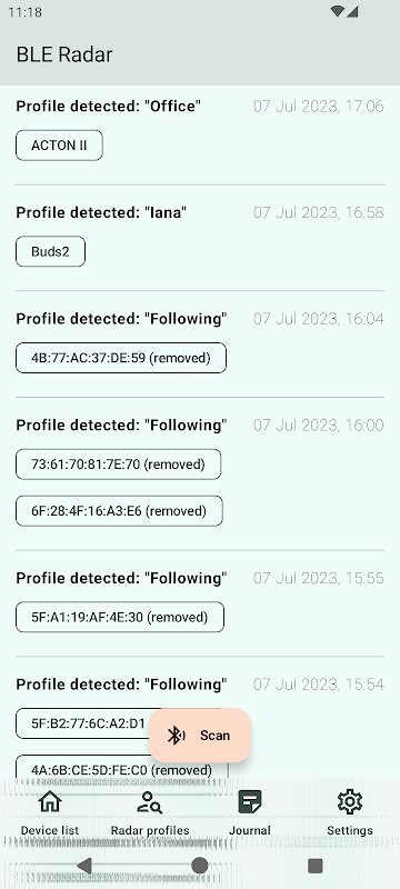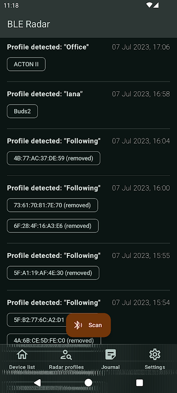 แอพนี้ให้คุณสร้างตัวกรองที่ยืดหยุ่นสำหรับเรดาร์ด้วยตัวดำเนินการเชิงตรรกะ สามารถแยกแยะผู้ผลิต สำรวจแพ็คเกจ Apple Airdrop และจับคู่กับผู้ติดต่อที่รู้จักได้ สร้างแผนที่การเคลื่อนไหวของอุปกรณ์โดยอิงจาก BLE อีเธอร์ที่สแกนรอบตัวคุณ ตัวอย่างเช่น คุณสามารถค้นหาอุปกรณ์ที่คุณเห็นในช่วงเวลาหนึ่ง รับการแจ้งเตือนหากจู่ๆ หูฟังที่หายไปก็ปรากฏขึ้นใกล้ตัวคุณ