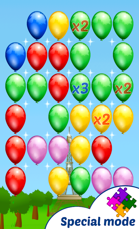 ในโหมด "ปารีส" - ทำเครื่องหมายเส้นทางของบอลลูนที่อยู่ใกล้เคียงด้วยสีเดียวกัน (แนวนอน แนวตั้ง หรือมุม) หากคุณทำเครื่องหมายและสาดลูกโป่งอย่างน้อย 7 ลูก คุณจะได้รับหนึ่งในโบนัสพิเศษ ยิ่งคุณสาดลูกโป่งมากเท่าไร คะแนนก็ยิ่งสูงขึ้นเท่านั้น
