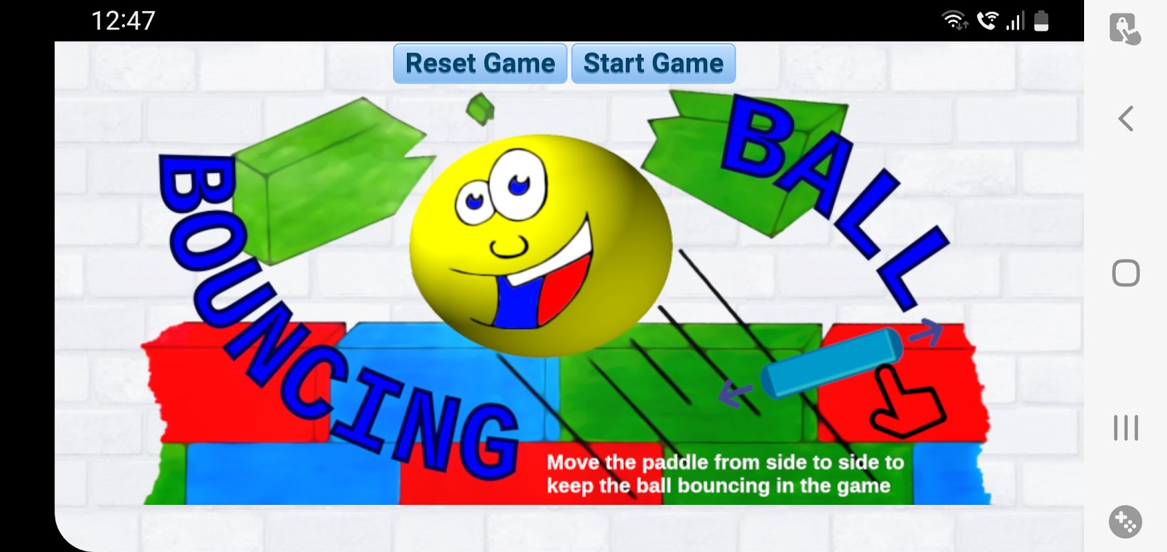 แตะที่หน้าจอและเลื่อนไม้พายจากด้านหนึ่งไปอีกด้านหนึ่งเพื่อให้ลูกบอลกระดอนในเกม คุณมี 3 ชีวิต ทุกครั้งที่คุณพลาดบอล คุณจะสูญเสียชีวิต ตีก้อนอิฐด้วยลูกบอลเพื่อทำลายพวกมัน ทำลายอิฐทั้งหมดและย้ายไปยังระดับถัดไป ทุกๆ 5 ระดับ ไม้พายจะหดตัวลง