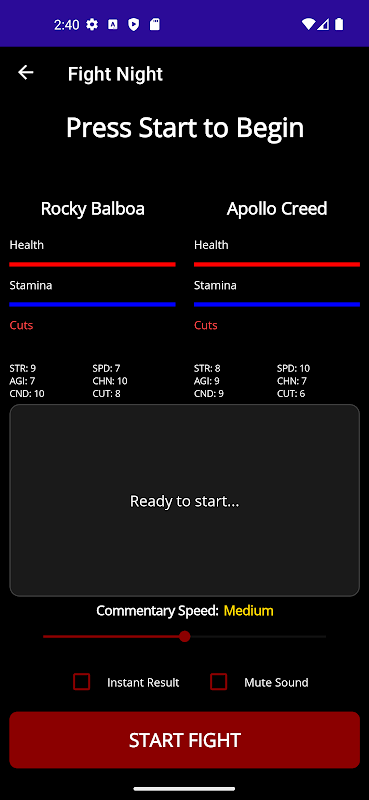 ควบคุมโปรแกรมจำลองการต่อสู้ สร้างแมตช์ในฝันของคุณเองโดยใส่ชื่อนักสู้ที่คุณกำหนดเองและปรับแต่งคุณสมบัติของพวกเขา สร้างนักชกหมัดหนัก นักสวนหมัดเร็ว หรือเครื่องจักรแห่งความแข็งแกร่ง