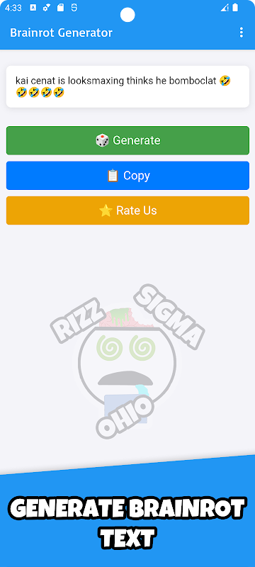 Brainrot Generator มีชุดคำศัพท์ Brainrot มากมาย เช่น rizz, giga chad, ohio, griddy และอีกมากมาย เพียงแตะสร้างแล้วแอปจะจัดการส่วนที่เหลือเอง