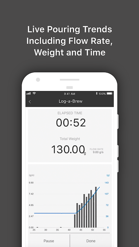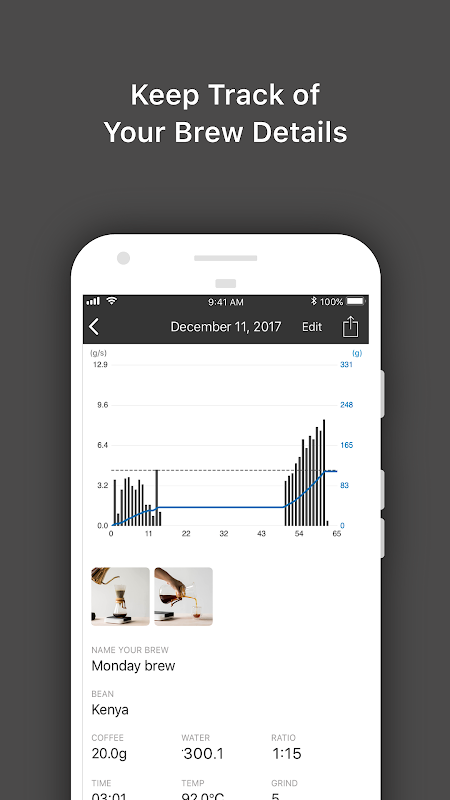 คุณสมบัติ: เข้าสู่ระบบ-a-ชง: เข้าสู่ระบบกระบวนการผลิตเบียร์วิธีการบันทึกและรสชาติกาแฟของคุณชงกาแฟที่ดีกว่าที่มีขนาด acaia กาแฟ แบบ Real-time เห็นภาพ Brewing การพิมพ์: การปรับปรุงการผลิตเบียร์กาแฟกับแผนภูมิการไหลแบบ real-time ที่สะท้อนให้เห็นถึงความเร็วในการไหลของอัตราการไหล, เรียนรู้วิธีการสกัดกาแฟและชงถ้วยเหลือเชื่อของกาแฟที่มีรสชาติดี