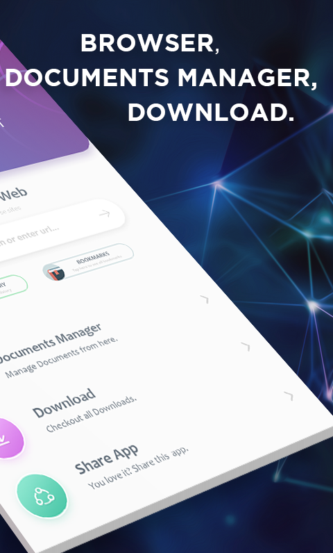 Browser and Documents Manager or Browser and File Manager allows you to not only access a Private Browser but to also access Documents Manager or File Manager allowing you to make your tasks easier. The Private Browser allows you Private Browsing including functions like Bookmark, Recent Search and Multiple Tabs where as the Documents Manager or the File Manager allows you to manager documents and file.