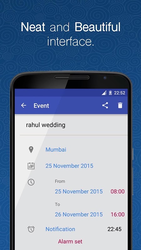 มีการเฉลิมฉลองงานวันเกิด, งานแต่งงาน, วันครบรอบที่จะเกิดขึ้น? พบว่ามันยากที่จะติดตามเหตุการณ์ที่เกิดขึ้นทั้งหมดหรือมีแนวโน้มที่จะลืมวันสำคัญ? คุณลักษณะนี้เป็นโซลูชั่นที่สมบูรณ์แบบสำหรับคุณ เพิ่มบุคคลที่จะเกิดขึ้นของคุณ, แต่งงาน, วันครบรอบทั้งหมด คุณสามารถตั้งค่าการแจ้งเตือนสำหรับเหตุการณ์ที่คุณเลือกได้ นอกจากนี้คุณยังสามารถเพิ่มการเตือนภัยก่อนที่จะมีการจัดกิจกรรมเพื่อให้แน่ใจว่าคุณไม่ลืมเกี่ยวกับพวกเขา