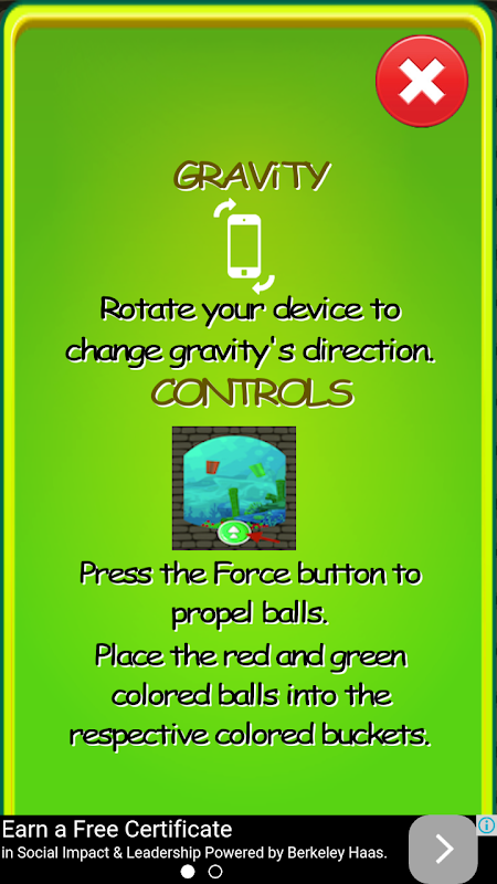 The basic concept of the game is to place the red and green colored balls into the respective colored buckets using a push and rotating the device as it needs. As quick as you can put all the balls into the respective buckets and record the time. For each level there will be two buckets, 1 is red and 1 is green. The number of red and green balls will be increasing as the levels increase.