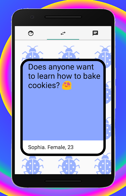 Simply write down your "Bug", which is the activity you want to do with your BuddyBug, and wait until someone swipes right on your Bug. In the meantime, swipe right or left on other people's bugs.