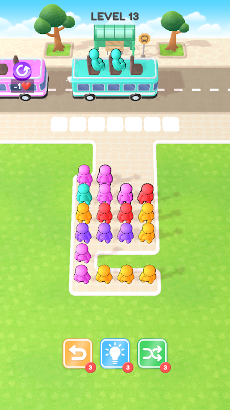 ใน Bus Stop Jam จับคู่ผู้โดยสารกับรถบัสตามสีด้วยการเคลื่อนไหวเชิงกลยุทธ์!