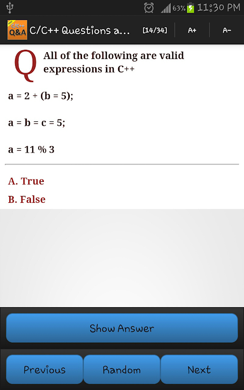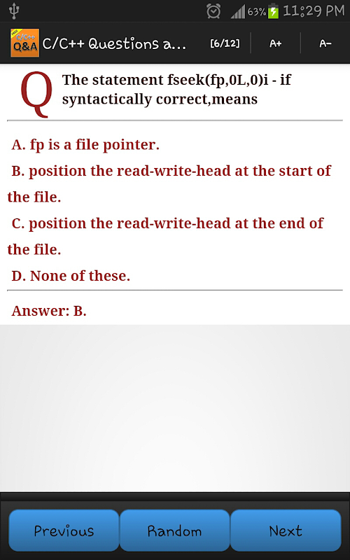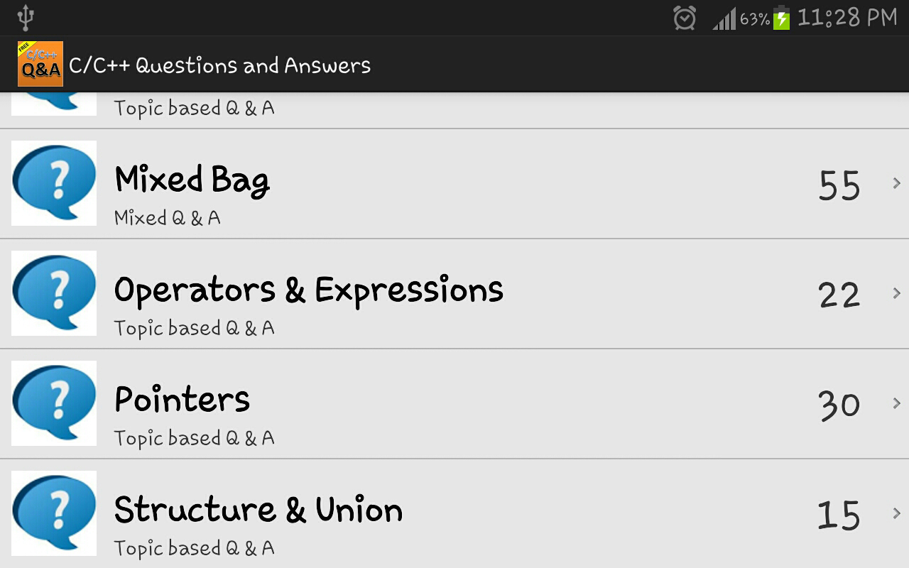 This android app includes multiple choice questions (MCQ) with their answers for computer exams. This app mainly focuses programming and its basic questions on C/C++ language.