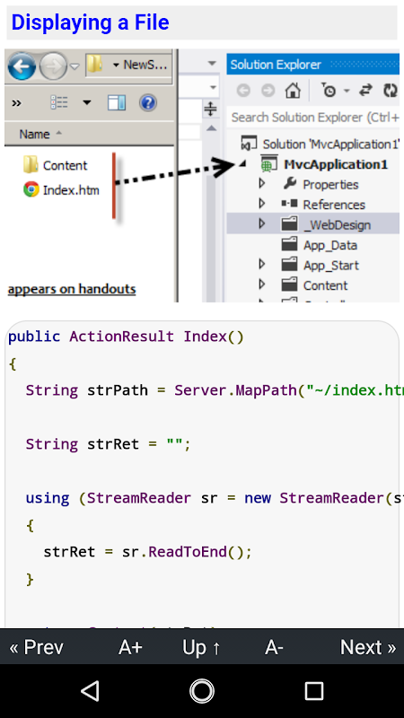 The material in this app was used by us in our classroom courses. The content is based on MVC 4, but can be easily adapted to MVC5 and later. The material is meant for a guided coaching session, so it may not be very user friendly.