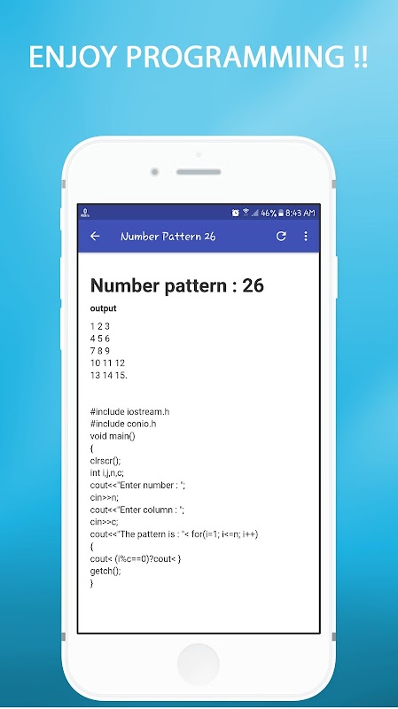 แอปมีรหัส C + + สำหรับการสร้างรูปแบบที่แตกต่างกัน (เช่นศิลปะ ASCII, ปิรามิด) ซึ่งเป็นประโยชน์ในการศึกษาเนื้อหาที่เกี่ยวข้องกับการเขียนโปรแกรม C ++