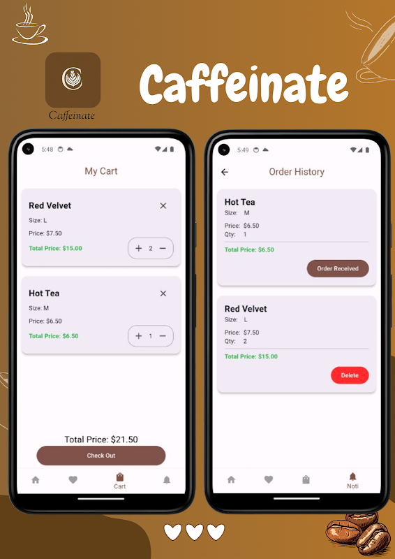 "Caffeinate" ปฏิวัติประสบการณ์ร้านกาแฟด้วยการขจัดคิวและเสนอราคาที่โปร่งใส ขณะนี้ผู้ใช้สามารถสั่งกาแฟออนไลน์ได้อย่างสะดวก โดยมีรายละเอียดราคาแสดงไว้ล่วงหน้า สำรวจเมนูร้านกาแฟ เพิ่มรายการโปรดสำหรับการเยี่ยมชมในอนาคต และสั่งอาหารจัดส่งถึงบ้านได้อย่างราบรื่น แอพฟรีนี้เหมาะสำหรับผู้ที่ชื่นชอบกาแฟที่กำลังมองหาความสะดวกและราคาไม่แพง โดยเชื่อมต่อกับร้านกาแฟในบริเวณใกล้เคียง สำหรับผู้ดูแลระบบ จัดการเมนู ราคา และคำสั่งซื้อได้อย่างง่ายดาย เข้าร่วมการปฏิวัติกาแฟด้วย "คาเฟอีน" เพื่อประสบการณ์กาแฟที่ไม่ยุ่งยาก (โครงการชั้นเรียน)