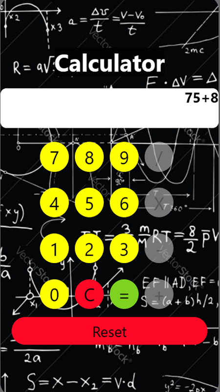 "The calculator app allows users to be able to perform mathematical processes with ease. With multiple functions including addition, subtraction, multiplication, and division, there are four different operations that the user can choose from. Aside from these operations, users can perform multiple calculations in succession, as the results of the previous calculation are saved and usable for the next. There are also the clear function, to be able to wipe previous mistakes as well as the reset function, to be able to reset the numbers inputted completely.