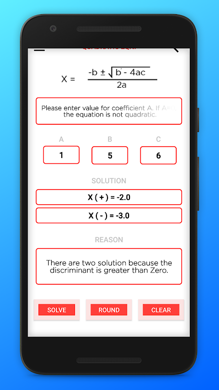 A simple calculator with a quadratic equation solver, simply enter the coefficients of the equation and get the solutions.
