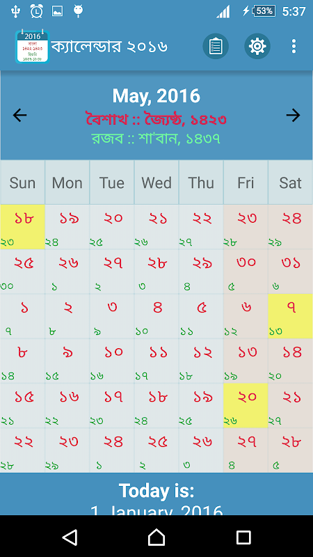 We bring this useful calendar application to celebrate the new year 2016. There are three calendars side by side: the Gregorian Calendar (English), Bengali Calendar and the Hijri (Arabic) Calendar. There are options to select which dates you want to see and in which order you want to see.
