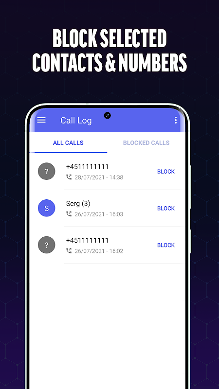 แอป Call Blocker เป็นผู้เฝ้าประตูส่วนตัวของคุณ โดยกรองสายเรียกเข้าอย่างพิถีพิถันเพื่อระบุและบล็อกหมายเลขสแปมก่อนที่จะส่งถึงคุณ ด้วยเทคโนโลยีการกรอง Call Blocker คุณจึงมั่นใจได้ว่าจะไม่ต้องจัดการกับการโทรสแปมอีกต่อไป
