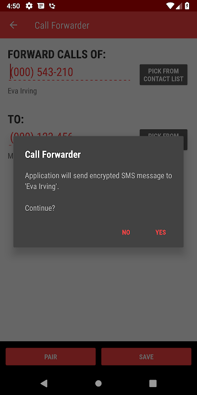 2. enter phone numbers 'FORWARD CALLS OF' and 'TO'
