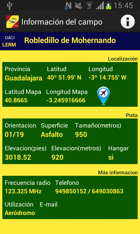 โปรแกรมนี้มีข้อมูลเกี่ยวกับที่มีอยู่ฟิลด์สเปนเที่ยวบินที่สามารถพบได้ในสนามบิน, ถนนทหาร, สนามบิน, microlight กอล์ฟ (เฮิ), แทร็คป่า aterrizables พื้นที่ ...