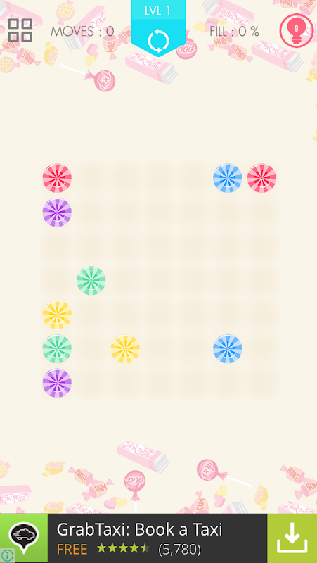 The best part of the mind game is its apparent simplicity and imbedded challenge. Joining the candies on board seems relatively easy but in reality they are difficult, complicated, and sometimes fairly brain storming. You have to join same colored candies by drawing lines in a way so that after you finish the joining spree, no space is left on the board. There are more rules to follow: You have to connect the lines in a way so no one override or overlaps each other.