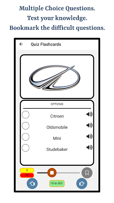 แอปนี้เป็นแหล่งข้อมูลที่ยอดเยี่ยมในการจดจำ โลโก้และตราสัญลักษณ์รถยนต์ แอพนี้ออกแบบมาเพื่อให้ผู้ใช้ระบุโลโก้และตราสัญลักษณ์รถที่มีชื่อเสียงได้อย่างสมบูรณ์แบบโดยการศึกษาในระยะเวลาอันสั้น ฟังก์ชันเสียงและบุ๊กมาร์กมีให้ใช้งานในแอปทั้งแบบบท ส่วน โหมดการศึกษา และโหมดแบบทดสอบ