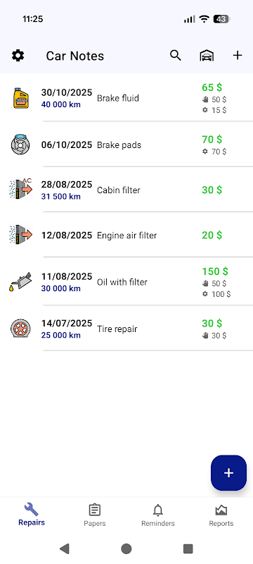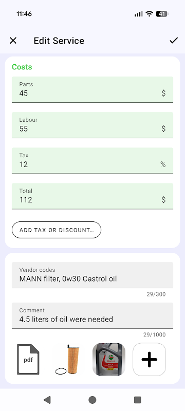 •การจัดการบริการรถยนต์: เพิ่มค่าซ่อมรถประกันค่าปรับและค่าใช้จ่ายอื่น ๆ คุณสามารถระบุค่าอะไหล่และค่าแรงแยกกัน แนบรูปถ่ายในบันทึกการบำรุงรักษารถของคุณ รับบริการและถ่ายภาพทุกสิ่งที่สำคัญไม่ว่าจะเป็นผู้ผลิตน้ำมันและเกรดบิลการชำระเงินหรือแม้แต่ใบหน้าของพนักงานบริการ! การดำเนินการบริการและค่าใช้จ่ายด้านเอกสารจะถูกแยกบัญชี โดยปกติแล้วค่าบริการรถยนต์จะน่าสนใจกว่ามากในการติดตาม แต่สิ่งสำคัญคืออย่าลืมวันหมดอายุของประกันด้วย