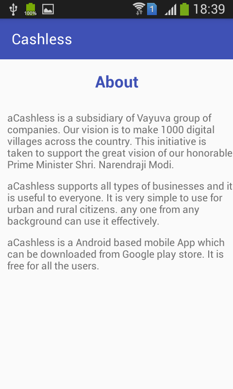 Cashless is a subsidiary of Vayuva group of companies. Our vision is to make 1000 digital villages across the country. This initiative is taken to support the great vision of our honorable Prime Minister Shri. Narendraji Modi.