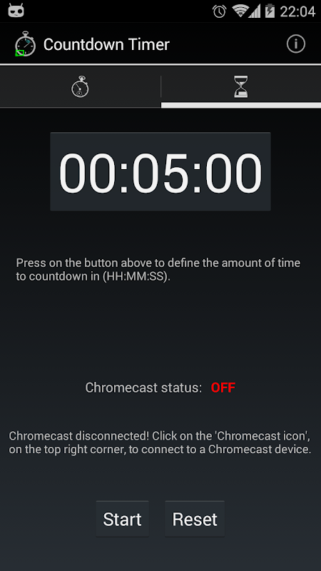 CastClock allows you to track the time with a Timer and a Countdown Timer, you can use it standalone or integrated with Chromecast (displaying the timer on your TV's screen). It works with OR without Chromecast.