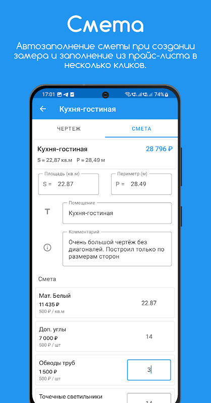 คุณสามารถคำนวณการประมาณราคาได้อย่างรวดเร็วโดยไม่ต้องใช้แบบแปลน เพียงป้อนความยาว ความกว้าง พื้นที่ หรือเส้นรอบวง ในการประมาณราคาแต่ละครั้ง คุณสามารถเพิ่มชื่อเรื่อง ความคิดเห็น ตลอดจนผลิตภัณฑ์และบริการจากรายการราคาของคุณได้ ซึ่งทำให้แอปพลิเคชันนี้เป็นเครื่องมืออเนกประสงค์สำหรับการประมาณต้นทุนและวัสดุของโครงการ