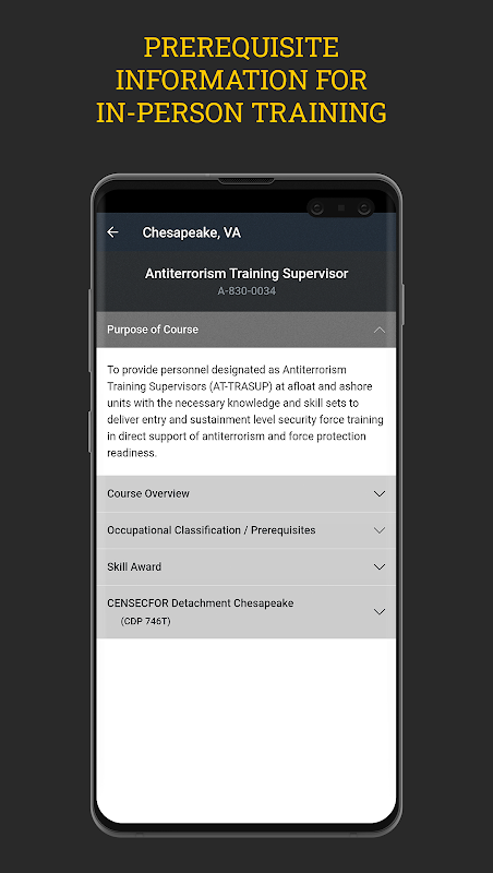 กล่องเครื่องมือของ Center for Security Forces (CENSECFOR) ให้การเข้าถึงหลักสูตรการฝึกอบรมอาวุธที่เลือกตามความต้องการและคู่มือการฝึกอบรมอัตรา Master-at-Arms (MA) แบบโต้ตอบใหม่ แอปนี้ยังส่งข้อมูลที่นักเรียนจำเป็นต้องรู้ก่อนรายงานไปยังไซต์การเรียนรู้ของ CENSECFOR