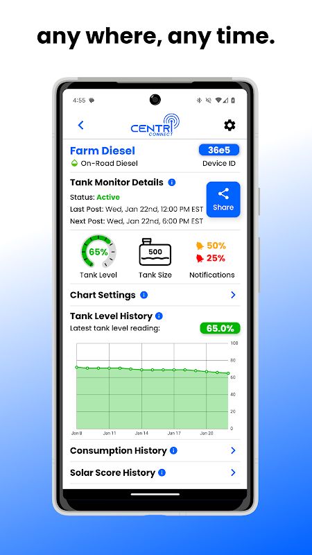 ไม่ต้องเดาเรื่องการจัดการเชื้อเพลิง ดาวน์โหลดแอป CentriConnect วันนี้เพื่อการตรวจสอบที่ชาญฉลาดยิ่งขึ้น การแจ้งเตือนทันเวลา และความอุ่นใจอย่างสมบูรณ์! จับคู่กับ CentriConnect Tank Monitor เพื่อประสบการณ์ที่ไม่มีใครเทียบได้ ทำให้ทุกหยดมีค่า!