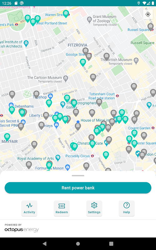 ChargedUp ได้สร้างเครือข่ายสถานีสำหรับธนาคารพลังงานแบบพกพา เช่าพาวเวอร์แบงค์และใช้งานขณะอยู่ในสถานที่นั้นหรือนำติดตัวไปด้วยและชาร์จไฟได้ทุกที่ พาวเวอร์แบงค์มาพร้อมพอร์ตฟ้าผ่าของตัวเองโดยไม่จำเป็นต้องมีสายเคเบิลของคุณเอง