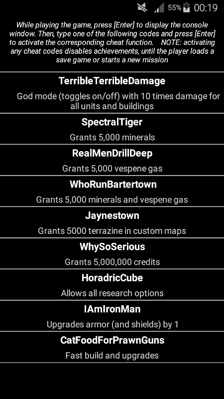 ข้อมูล Cheat codes for StarCraft 2 APK