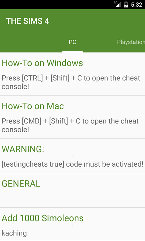 Cheats for the Sims is an application that makes you able to cheat on your Playstation, Xbox and PC. The cheats are easily accessed on your Android smartphone or on your tablet while playing your favourite The Sims game. The application does not required internet connection and can be reached when you have no interenet connection.