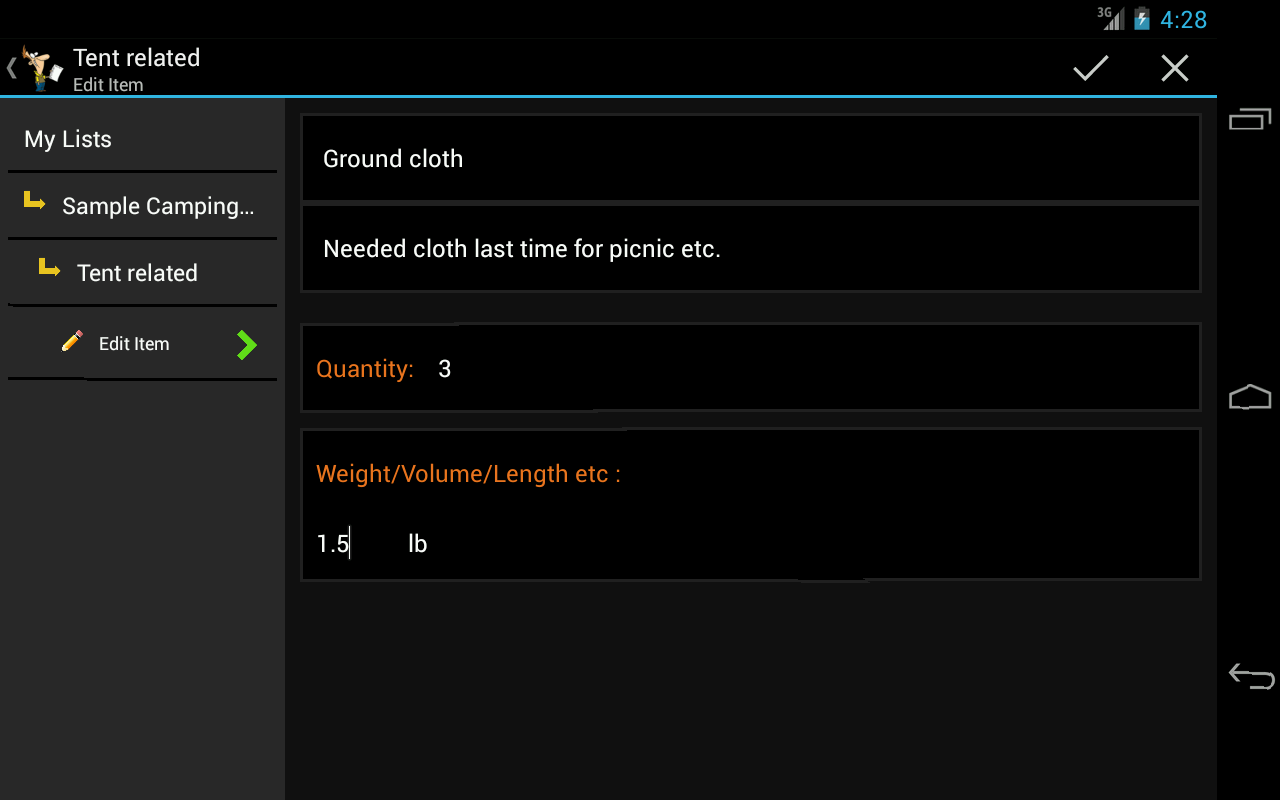 This app is a simple checklist for your everyday needs. Very simple and intuitive to use.