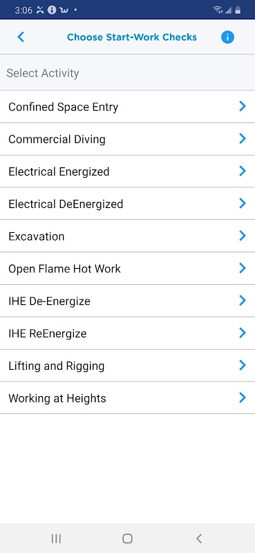 The Chevron Start Work Checks App is a mobile verification tool designed to help field workers confirm appropriate safeguards are in place and “Save Your Life Actions” are completed immediately prior to the start of high work activities. The app supports overall efforts to eliminate serious injuries and prevent work site fatalities.
