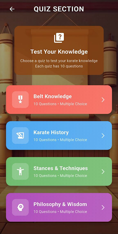 ทดสอบความรู้ของคุณด้วยแบบทดสอบเฉพาะทาง 4 ส่วน ซึ่งแต่ละส่วนมีคำถามที่ชวนให้คิด 10 ข้อ เกมไก่ถนน 2 หัวข้อต่างๆ มีตั้งแต่ประวัติศาสตร์และคำศัพท์ของคาราเต้ไปจนถึงชื่อเทคนิคและแนวคิดการฝึก ติดตามความคืบหน้าในการเรียนรู้ของคุณด้วยสถิติประสิทธิภาพและข้อเสนอแนะทางภาพซึ่งจะช่วยให้คุณพัฒนาทักษะคาราเต้ให้ดีขึ้นเมื่อเวลาผ่านไป เกมไก่ถนน 2.0