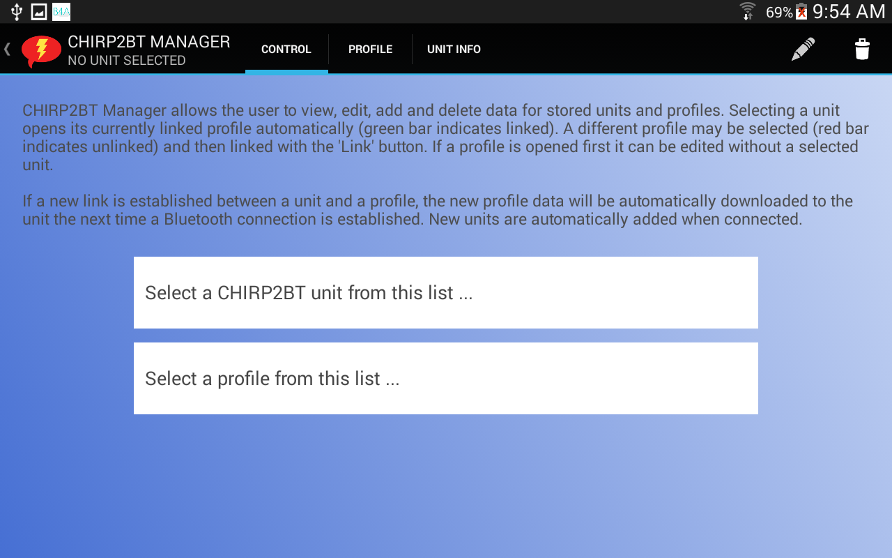 CHIRP2BT Remote connects via Bluetooth and recognizes all powered CHIRP2BT devices within an approximately 30ft radius and provides the opportunity to connect to one of them (FMAER or AER). Once connected, the app uploads connected device information including the installed (paired) profile ID and calibration details.