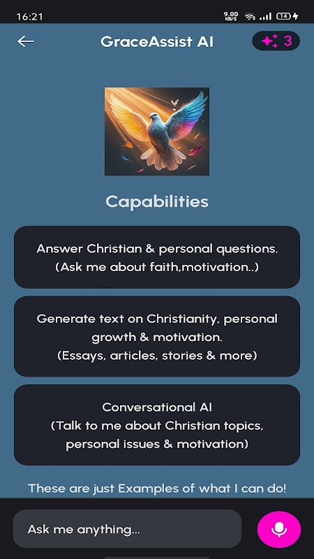ประสบการณ์ที่ปรับแต่งได้: ปรับแต่งการโต้ตอบของคุณด้วย GraceAssist ให้เหมาะกับความต้องการของคุณ ปรับการตั้งค่า ตั้งค่าการเตือน และปรับแต่งประสบการณ์การแชทของคุณให้สอดคล้องกับการเดินทางทางจิตวิญญาณของคุณ