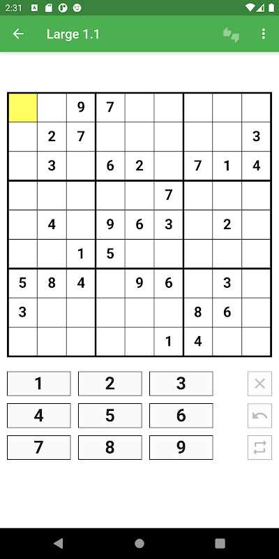 The objective is to fill a 9×9 grid with digits so that each column, each row, and each of the nine 3×3 subgrids ("boxes") that compose the grid contain all of the digits from 1 to 9. The puzzle starts with a partially completed grid. All puzzles have one and only one solution.