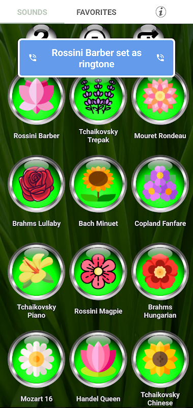🎶 เล่นเสียง: ใช้แอปเป็นซาวด์บอร์ดเพื่อฟังและดูตัวอย่างคอลเลคชันเสียงเรียกเข้าเพลงคลาสสิก 45 รายการ แต่ละองค์ประกอบมีเสียงดังและชัดเจน ให้คุณดื่มด่ำไปกับความงามเหนือกาลเวลาของดนตรีคลาสสิก