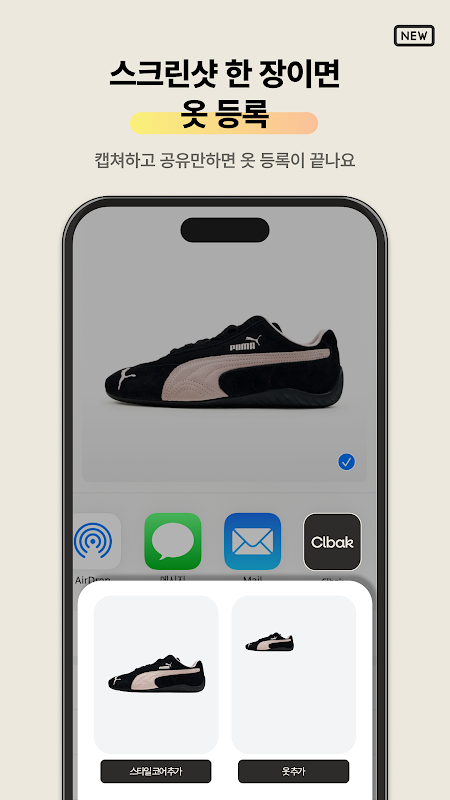 - ‘공유하기’로 옷 등록: 스크린샷 후 바로 옷/스타일코어를 등록할 수 있어 더 편리해졌어요.
