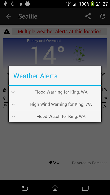 It covers virtually any place in the world, including weather alerts on selected countries. When a place has a weather alert you will get an alert message, clicking on it will expand the info of the alert.
