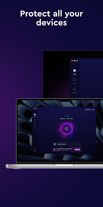 คุณไม่จำเป็นต้องดำดิ่งสู่โลกความปลอดภัยออนไลน์เพื่อใช้ ClearVPN เพียงเปิด VPN เพื่อการป้องกันที่ดีขึ้นหรือตัดสินใจเปลี่ยนตำแหน่งแบบดิจิทัล แล้วเราจะจัดการส่วนที่เหลือเอง แตะเพียงครั้งเดียว คุณก็ไปได้เลย!
