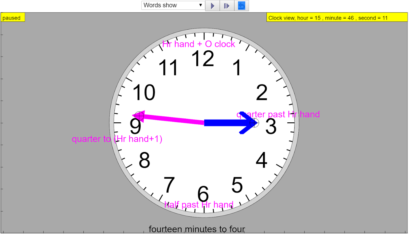 การจำลองการสอนจะเริ่มทำงานทันทีโดยแสดงเวลาโลกแห่งความเป็นจริง เข็มวินาที (สีแดง) จะถูกซ่อนไว้โดยค่าเริ่มต้นเพื่อให้ดูเรียบง่าย มุมมองที่เรียบง่ายมีเพียงเข็มชั่วโมง (สีน้ำเงิน) และนาที (MAGENTA หรือที่เรียกง่ายกว่านั้นคือ PINK?) องค์ประกอบแบบอินเทอร์แอกทีฟจะแสดงเป็นวงกลมกากบาทบนเข็มชั่วโมงนาทีและวินาทีซึ่งจะคำนวณตำแหน่งตามลำดับโดยอัตโนมัติ
