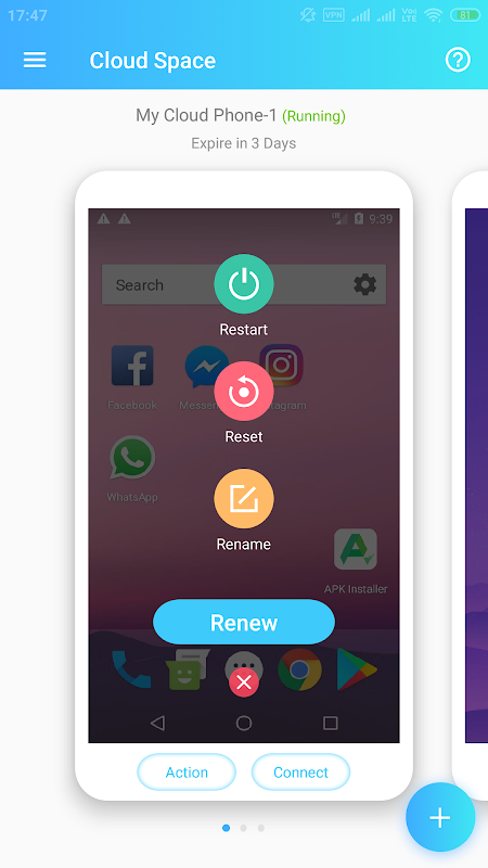 Cloud Space is a pay-as-you-go cloud service for apps and games. It provides you a cloud phone and keeps your apps running in the cloud, and keeps your data safe and secure.