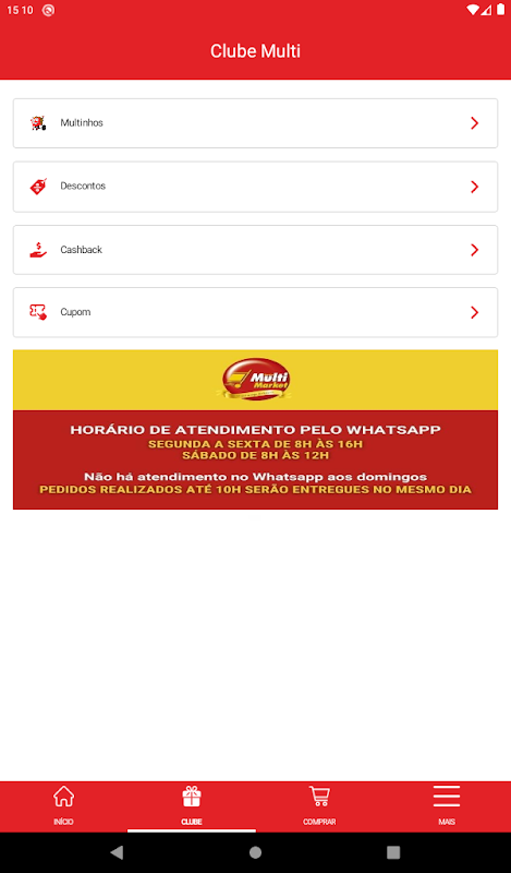 คุณสามารถสั่งซื้อและติดตามสถานะคำสั่งซื้อของคุณ เมื่อซื้อของที่ซุปเปอร์มาร์เก็ต Braga คุณสามารถสะสมคะแนนที่แลกเป็นของขวัญได้ที่ Clube Multi App หลังจากแลกคะแนนเป็นของขวัญแล้วคุณสามารถรับของขวัญได้ที่ร้านในซูเปอร์มาร์เก็ตของ Braga หากไม่มีของขวัญที่ต้องการคุณสามารถ "แลก" ของขวัญเพื่อรับคะแนนและเลือกของขวัญใหม่ คุณยังสามารถแชร์คะแนนของคุณกับเพื่อน ๆ