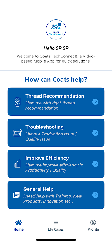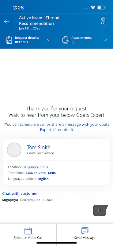 Coats TechConnect เป็นวิธีที่เร็วที่สุดในการรับคำแนะนำเกี่ยวกับเธรดและแก้ไขปัญหาที่เกี่ยวข้องกับเธรด เพียงส่งแบบฟอร์มสั้นๆ แล้วคุณจะถูกจับคู่กับที่ปรึกษาด้านบริการด้านเทคนิคซึ่งจะเริ่มทำงานตามคำขอของคุณทันที Coats' Advisors เป็นผู้เชี่ยวชาญชั้นนำในอุตสาหกรรมด้าย จักรเย็บผ้า การปฏิบัติตามกฎระเบียบ ประสิทธิภาพ และความยั่งยืน เมื่อส่งคำขอของคุณแล้ว คุณสามารถแชทและกำหนดเวลาแฮงเอาท์วิดีโอกับที่ปรึกษาด้านบริการด้านเทคนิคที่ได้รับมอบหมายได้ คำขอยังคงเปิดอยู่จนกว่าพวกเขาจะได้รับการแก้ไขจนเป็นที่พอใจของคุณ