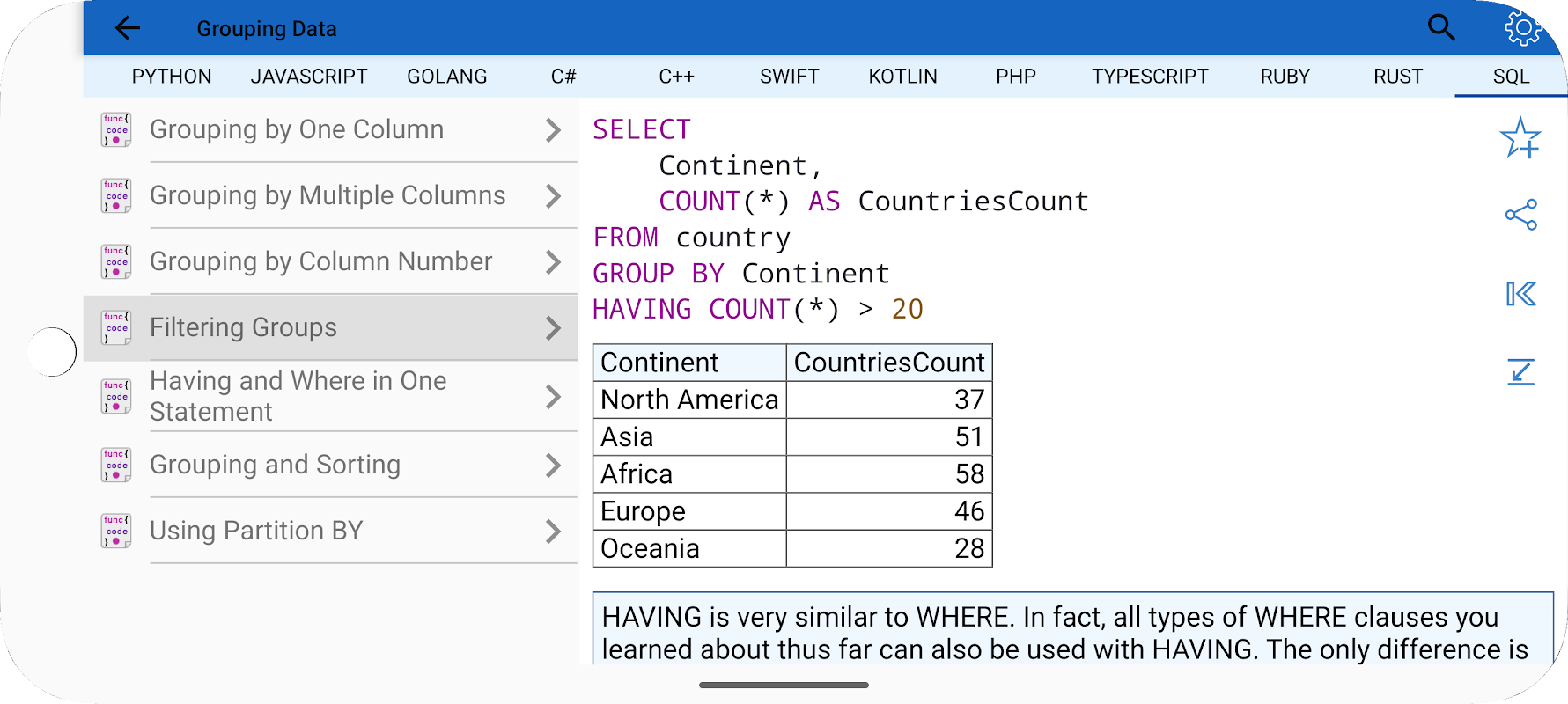 • ไดเร็กทอรีของการดำเนินการมาตรฐานที่ใช้บ่อยในคำสั่ง Swift, Java, JavaScript, Python, Rust, PHP, C#, C++, Golang, TypeScript, Kotlin, Ruby และ SQL ตัวอย่างโค้ดมากกว่า 300 รายการสำหรับแต่ละภาษา